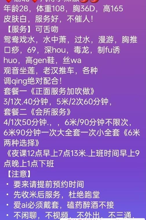 老师是从东莞过来的,课表写的主打服务。也挺便宜的3p5pp性价比不错,小区无摄像头自由进门。穿着一身黑丝开门等我,态度好倒了温开水给我喝。一开始就跳骚舞吸引我,手机放着暧昧的音乐,一边跳舞一边用手抚摸我的小弟,拿着我的手摸它的大胸,d罩杯有的,跳了几分钟我就躺着叫她服务了,口活有节奏,用嘴吞下整个蛋蛋,毒龙含着热水,舌头用力往里顶,整得菊花灿烂,老师的妹妹里面有肉齿,插进去咬的紧紧的,越草水越多,我选了2次,第一炮没多斤就交代了,第二次各种姿势,老师叫的更骚了,十几分钟后完事抽根烟就走了,爱好服务的来冲吧。