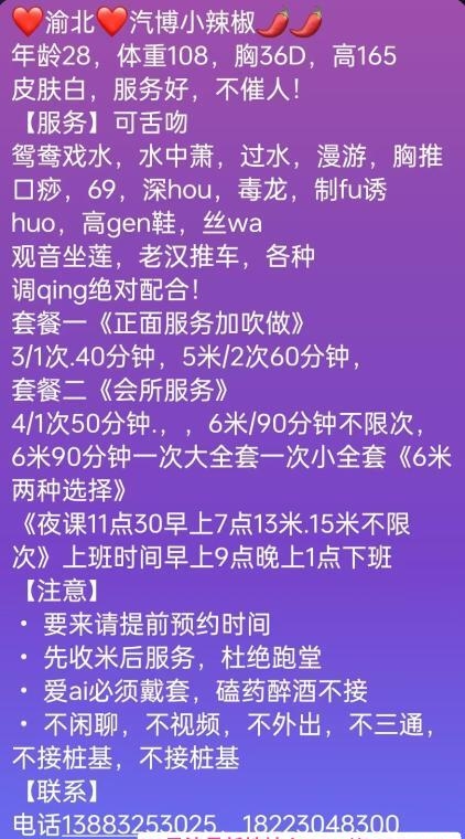 颜值很有日像,皮肤白嫩细滑,态度骚气随和,做爰呻吟声很有诱惑力,服务认真仔细,服务一流,毒龙一流,猴子偷桃,回马枪一绝,深喉口活节奏非常舒爽,整体服务很好